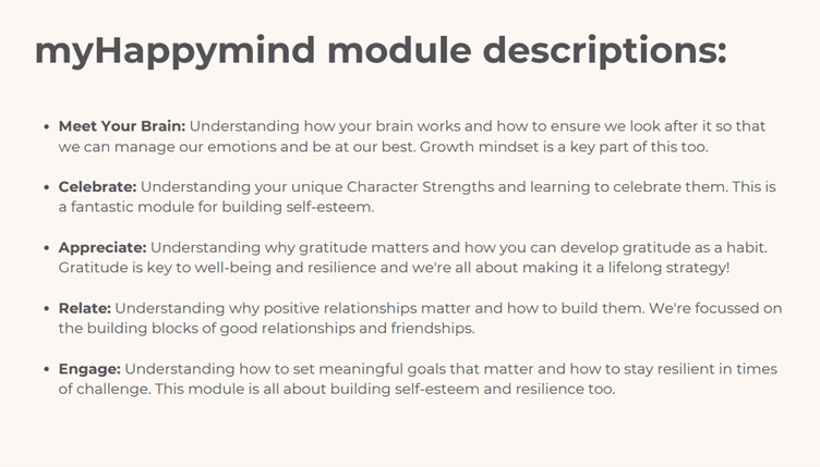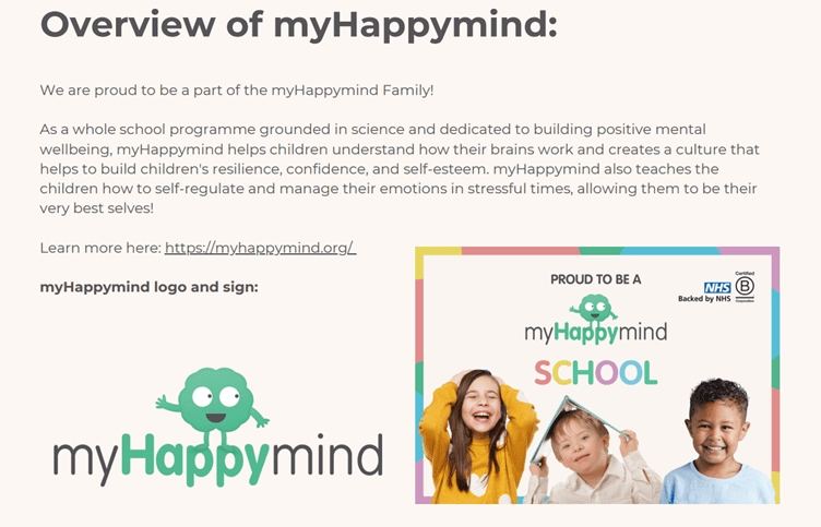 My Happy Mind is designed as a whole school approach, with all year groups working on the same theme at the same time. This starts with an introductory assembly, generating a whole school focus for the children. We aim for the themes covered in the programme to be reflected in the children’s behaviour and attitudes throughout the whole of school life.